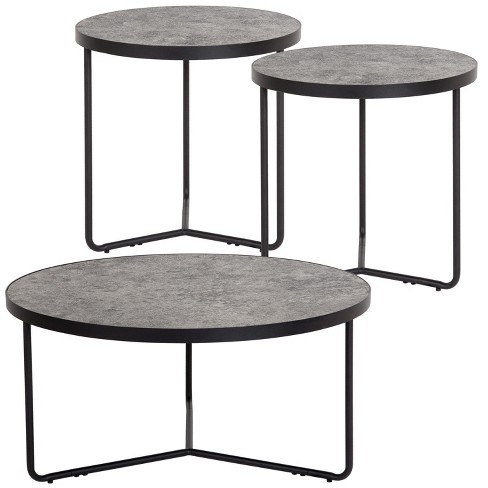 It includes two end tables, and one coffee table, which are all crafted from engineered wood and wood veneers in a dark brown finish that's perfect for pairing with neutral or punchy furniture. Browse coffee and end table sets for your living room in a variety of finishes, shapes and styles. Aged silver medium round metal coffee table set. By choosing matching tables you'll bring a sense of symmetry and harmony to your living room. This round 3 piece coffee table set has been curated designers to help you quickly add a touch of elegance to any space. Product title kinley 3 piece coffee table set, gray wood & black metal, industrial style average rating: Noorbrook table (set of 3) event featured. These coffee tables can also be used side tables, end tables or living room tables. 3 piece coffee table set. Tops have a bread board layup with a planked effect. 2 out of 5 stars with 1 ratings. Coffee tables and side tables. Round coffee table with deco stone finish.