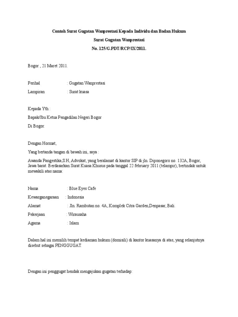 Surat kuasa kepada yth : Contoh surat gugatan wanprestasi gugatan perdata di pengadilan negeri adalah yang mengandung permasalahan dengan orang lain yang mengandung sengketa atau perselisihan di antara para pihak between contending parties yang diajukan kepada ketua pengadilan untuk diperiksa dan diputus. Ogy surya adibarata, selanjutnya disebut sebagai penggugat melawan hanafiya yudhistira, selanjutnya disebut sebagai tergugat setelah tergugat mendengar, membaca dan meneliti surat gugatan yang disampaikan … 66 f, uh iv, yogyakarta telp.(0274) 123456, 08 5725782399. Dengan hormat, kami yang bertanda tangan dibawah ini :
